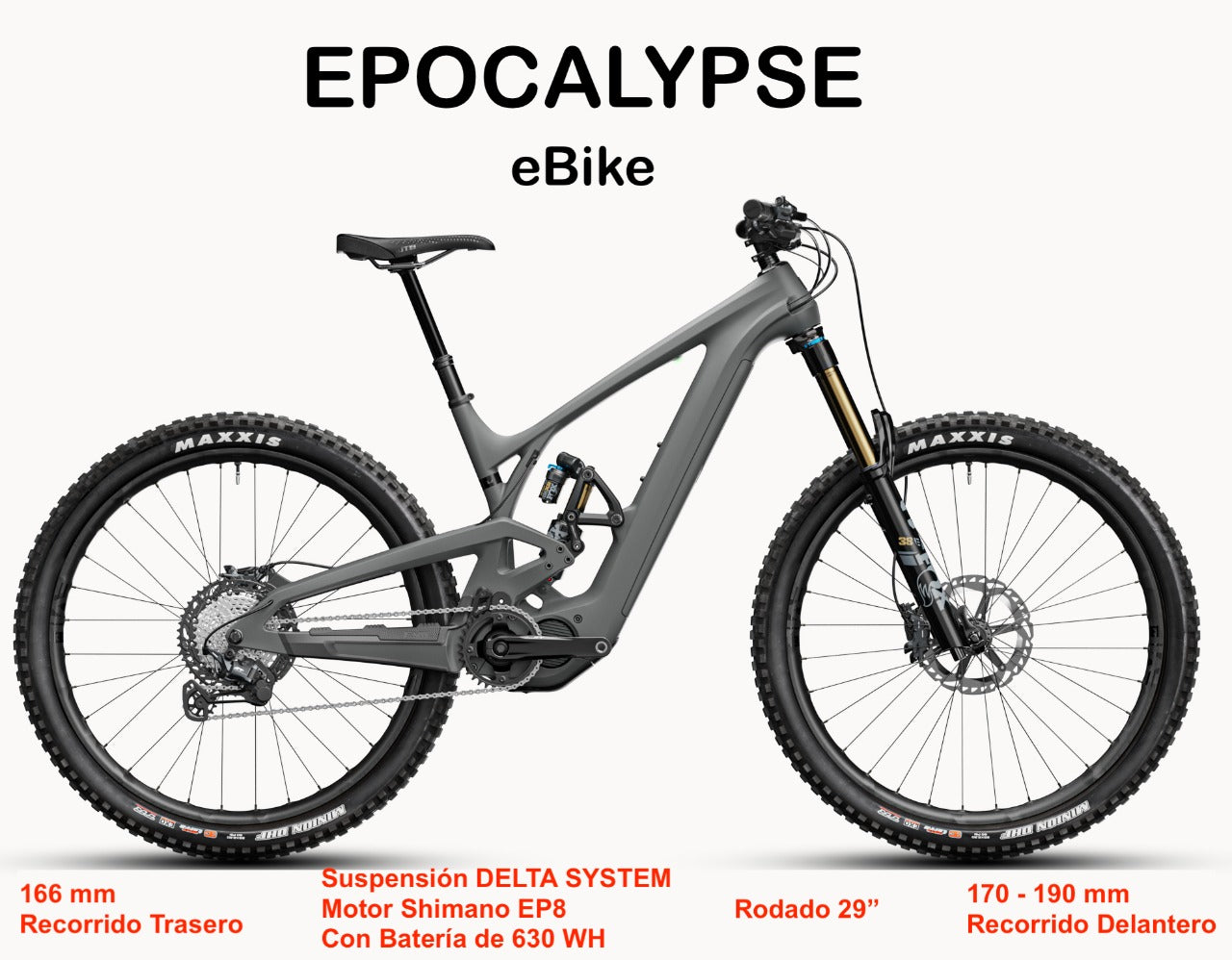 El Epocalypse impulsado por batería de 630wh de la marca BOSCH para dar el maximo de vueltas, se desplaza sobre dos ruedas de 29" con 166 mm de recorrido trasero y 170 mm debajo de las barras. La postura de esta bestia de género fluido se parece mucho a la de nuestra venerada máquina Wreckoning, lo que lo convierte en una fiesta de baile adecuada en lo profundo de los árboles.