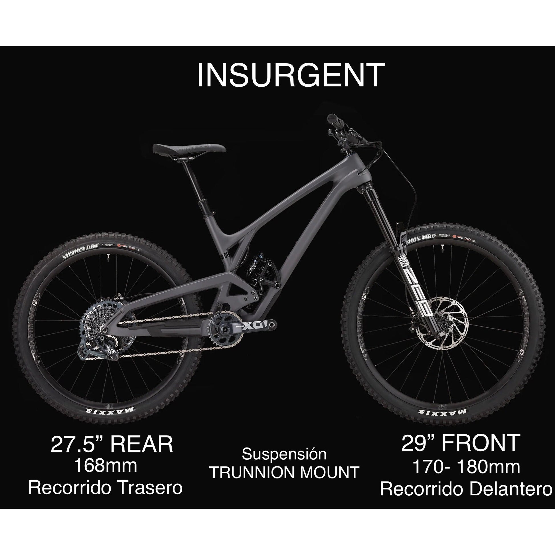 El Insurgent está disponible en la versión MX de 27.5"/29" con ruedas mixtas. Ruedas pequeñas para senderos, saltos, látigos y monte, o MX para una mayor tracción de la rueda delantera, líneas más empinadas, losas pesadas y trituración de chunder. 27.5 ”nunca murió. Simplemente dejó de preocuparse por lo que la gente piensa. Entra el Insurgente.